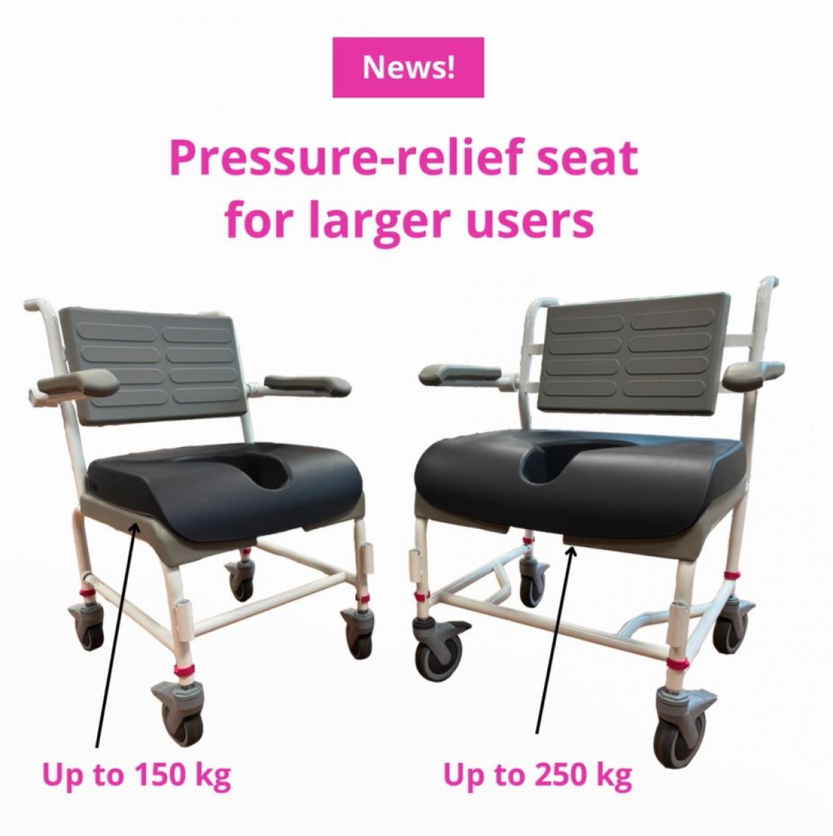 Our pressure-relief seat is now available in a version that fits shower-/commode chairs up to 250 kg!