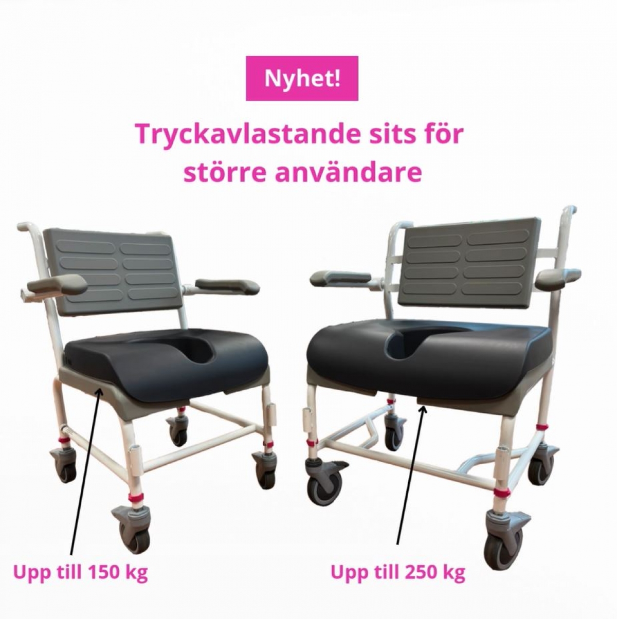 Vår tryckavlastande sits finns nu i en version som passar till dusch-/toalettstolar upp till 250 kg!